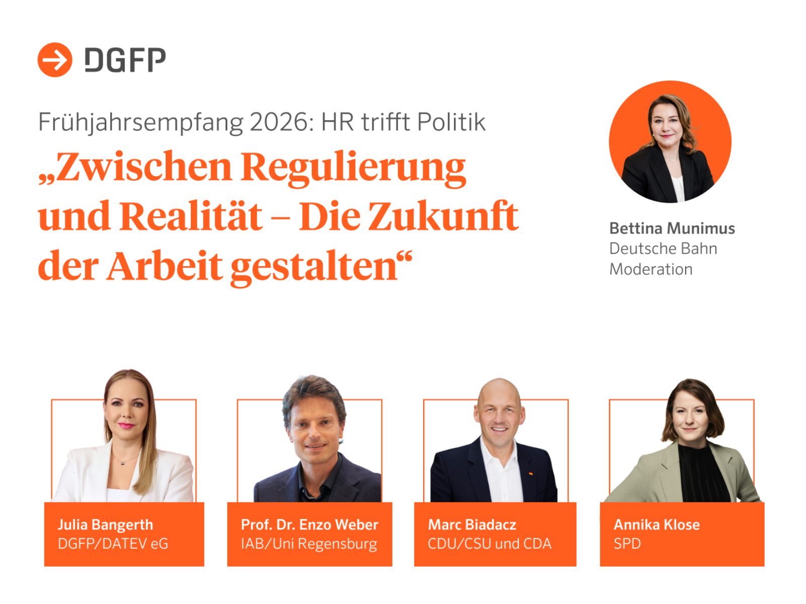 Unter dem Motto „HR trifft Politik: Zwischen Regulierung und Realität – Die Zukunft der Arbeit gestalten“ diskutiert die DGFP-Vorstandsvorsitzende Julia Bangerth mit VertreterInnen aus Politik, Wirtschaft und Wissenschaft.